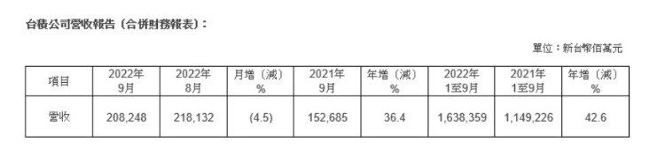 台积电9月营收2082.5亿新台币,同比增长36.4%,环比下降4.5%。2022年1月至9月营收总计1.64万亿新台币,同比增长42.6%。