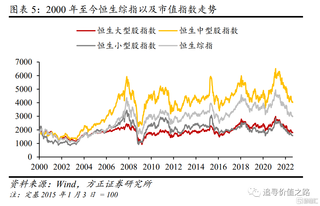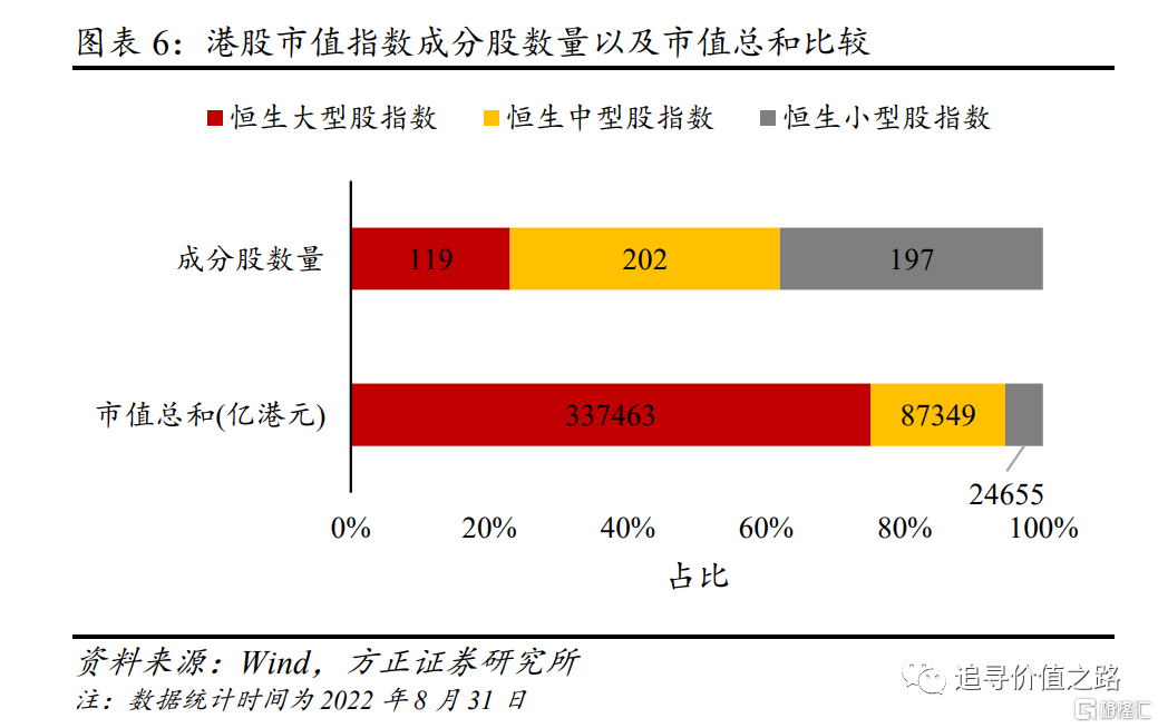我们选取恒生综合大型股(以下简称“恒生大型股”)指数和恒生综合小型股(以下简称“恒生小型股”)指数作为港股市值指数,指数的成分股作为港股大小盘股的代表样本。恒生大型股指数、恒生综合中型股(以下简称“恒生中型股”)指数以及恒生小型股指数分别覆盖恒生综合指数(以下简称“恒生综指”)成份股累计市值的前80%、次15%及末5%。恒生综指作为一个全面反映港股市场表现的指标,涵盖了在香港联合交易所(以下简称“港交所”)主板上市证券总市值最高的95%。