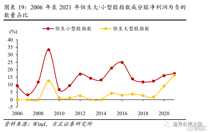 对于市盈率口径下整体法结果和中位数法结果之间的差异,我们认为原因在于港股小盘股中净利润为负(亏损)的股票占比较大市值股更高,导致在使用整体法计算指数市盈率时,位于分母的成分股净利润之和较低而市盈率较高。