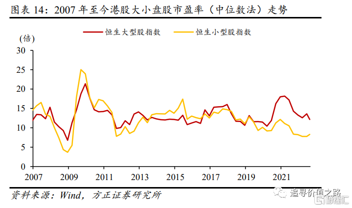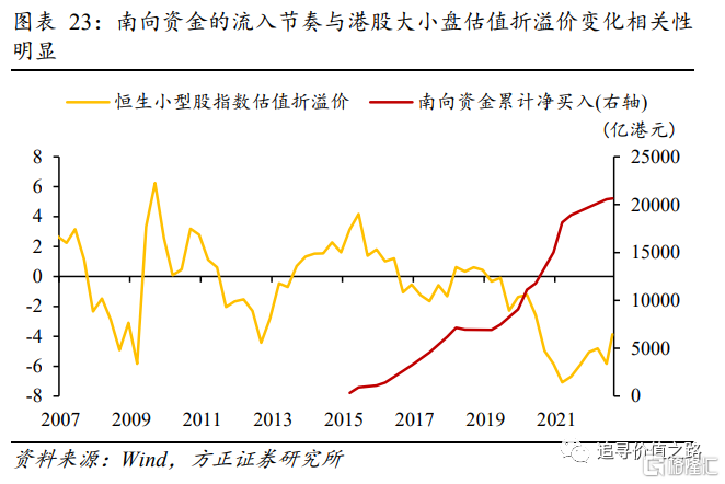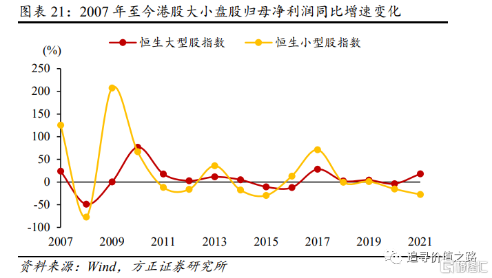 图2和图21分别展示了港股大小盘股的流动性分布和归母净利润同比增速的变化,港股大盘股较小盘股流动性更好、盈利也更稳定,我们认为这可能是大盘股能够长时间享受估值溢价的原因。