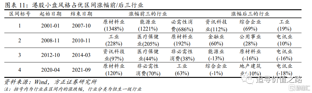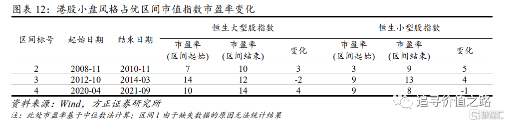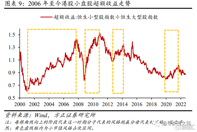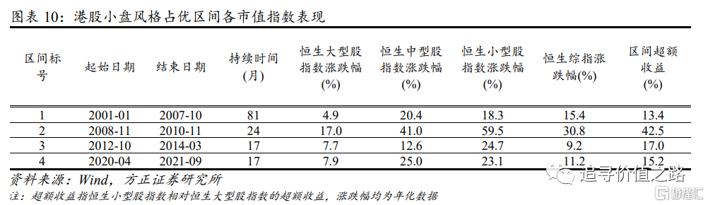 自2000年以来,港股一共发生了8次大小市值风格切换,其中港股小盘风格占优的区间一共有4段,分别为2001年1月-2007年10月、2008年11月-2010年11月、2012年10月-2014年3月以及2020年4月-2021年9月,持续时间分别为84个月、24个月、17个月和17个月。