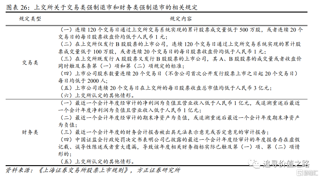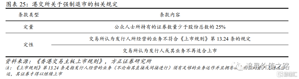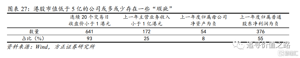 我们认为,港股市场上存在众多“仙股”的原因可能与港交所对强制退市标准的设置较为宽松有关。从条款上看,港交所制定的强制退市标准中仅有一条属于定量标准,且内容为关于公众持股数量占比的规定;反观上交所,不仅对强制退市的情形设置更加完备,其规定中定量条款的“含量”更高。关于强制退市上交所分别设置了交易类强制退市、财务类强制退市、规范类强制退市和重大违法类强制退市四类情形,对交易量、价格、市值等交易指标以及净利润、净资产等财务指标都做出了清晰的规定。