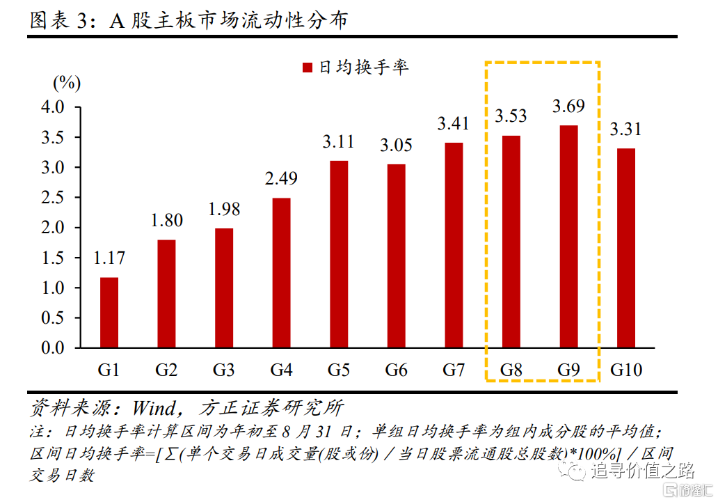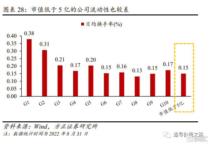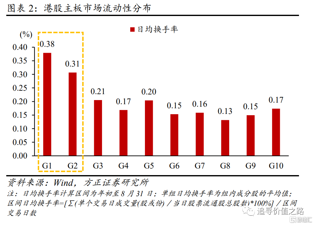 除小市值股票占比高外,港股市场的另一大特征为大市值股票的流动性显著高于小市值股票。用日均换手率作为流动性的观察指标,将港股主板市场所有股票按市值从大到小等分为10组,可以发现,市值最大的两组股票的日均换手率在0.3%以上,其他组均低于或约等于0.2%,流动性随着市值增大而变好;反观A股,流动性最好的股票组为小市值组(第8、9组),市值小的股票流动性更好。