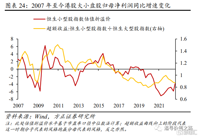 但是值得注意的是,存在估值溢价并不等同于存在正超额收益。估值折溢价作为变化量,存在折溢价并不意味着股价未来会走低或走高。港股小盘股在2008年年底处于估值折价状态,但此后两年却对大盘股存在明显的正超额收益。