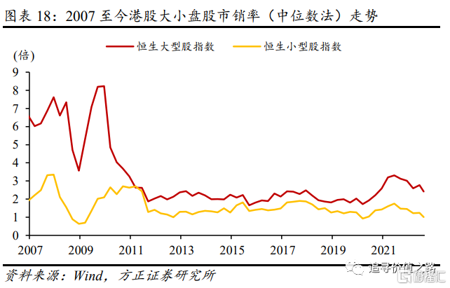 我们发现,不同的估值指标口径下,港股大小盘股的估值折溢价水平存在一定的差异。在用整体法计算的市盈率口径下,港股小盘股相对大盘股几乎在整个观察区间(2006年9月至2022年8月)内都存在估值溢价,而中位数法计算的结果则存在明显的波动,2017年之前大约每1.5到2年大小盘的估值折溢价就发生一次切换。在市净率和市销率口径下,小盘股却都基本处于估值折价状态。