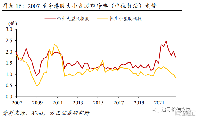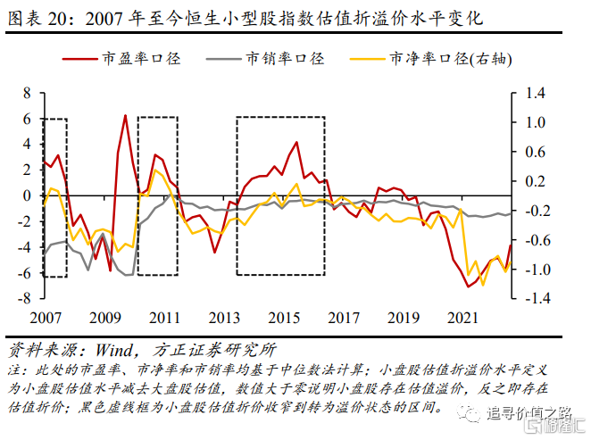 我们分别从市盈率、市净率和市销率三个口径测算港股大小盘股票的估值水平以及对应的估值折溢价。