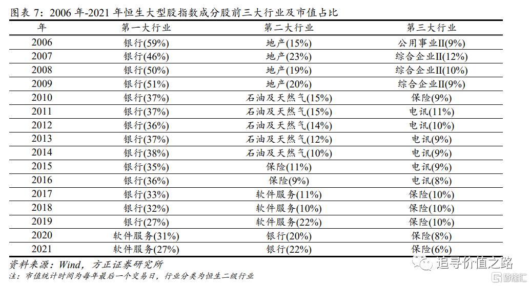 港股大盘股在行业分布上较为集中。恒生大型股指数成分股中,2017年以前市值占比高的行业主要为金融地产、能源和公用事业,此后以腾讯、美团以及阿里巴巴为首的软件服务业逐渐挤进前三。截至2022年8月31日,恒生大型股指数成分股市值占比前五大行业分别为软件服务(25%)、银行(23%)、保险(7%)、地产(7%)、石油及天然气(5%),互联网、金融以及地产这三个板块的市值占了恒生大型股指数总市值的50%以上。