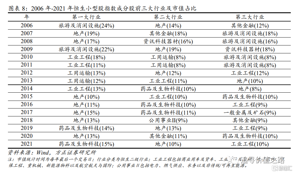 与大盘股主要分布在金融地产以及互联网行业不同,港股小盘股在行业分布上较为分散且变化较大。以恒生小型股指数成分股为例,第一大行业市值占比基本在20%以下,前三大行业市值占比之间的差值也更小。截至2022年8月31日,恒生小型股指数成分股市值占比前五大行业分别为工业工程(11%)、药品及生物科技(10%)、保险(9%)、地产(9%)、软件服务(8%)。