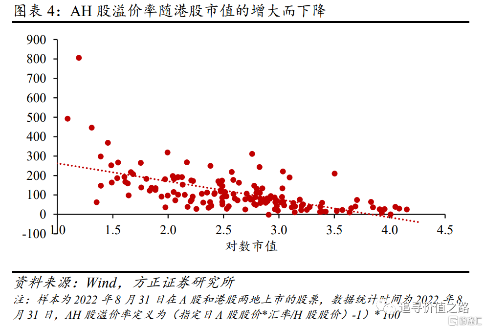 对于在A股和港股两地上市的股票而言,其港股市值大小与AH股溢价水平也存在着明显的关系:市值越大,AH股溢价水平越低;市值越小,则越便宜。