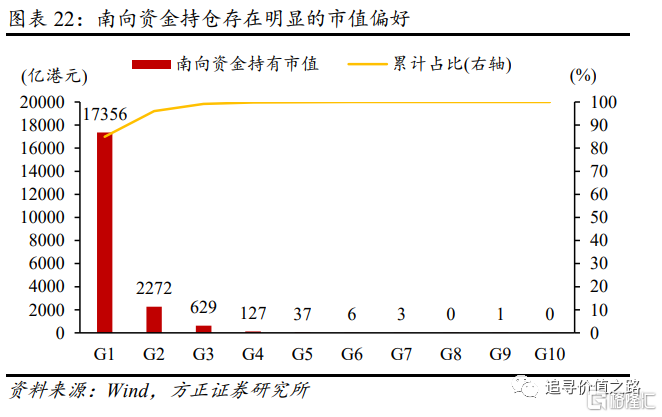 除上述因素外,我们还发现港股通的开立也对大小盘股的估值折溢价变化产生了一定的影响,2015年后估值折溢价水平基本随南向资金的节奏变动而变动。从持仓上看,南向资金对港股大盘股存在系统性的偏好。如果将港股主板市场所有股票按市值从大到小等分为10组,南向资金96%的持仓(市值口径)都在前两个组合中。