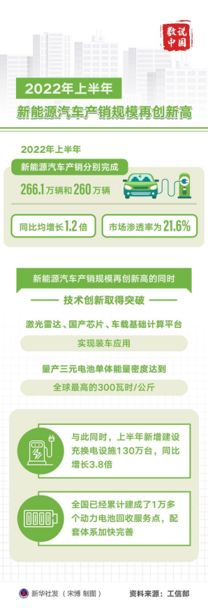 最直接的体现是2022年上半年新能源汽车产销规模再创新高:工信部数据显示,新能源汽车产销分别完成266.1万辆和260万辆,同比均增长1.2倍,市场渗透率为21.6%。