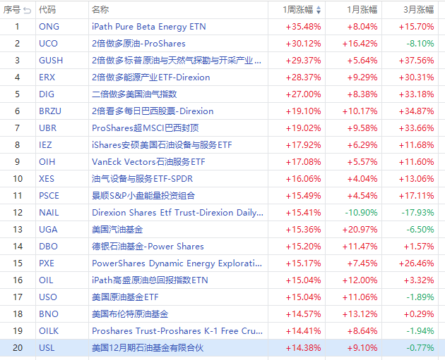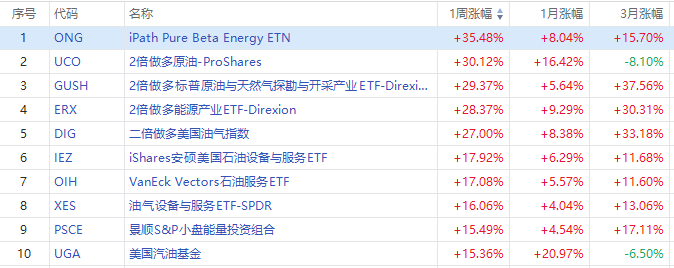 本周能源股大反攻,2倍做多油气服务的ONG $ONG 周涨 35.48%,2倍做多原油的UCO $UCO 涨幅超30%,多只能源ETF涨超20%。