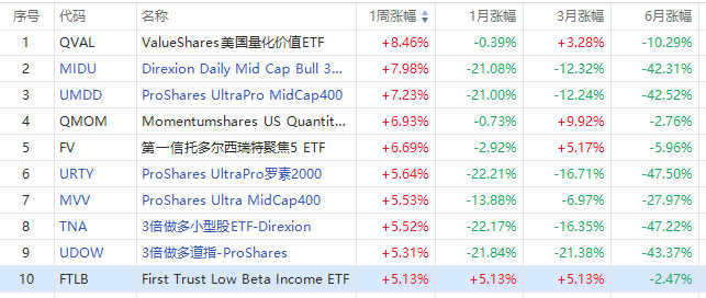美股股指ETF方面,本周重仓股主要为能源股的美国量化价值ETF $QVAL 涨8.46%,做多标普中等市值的MIDU $MIDU 、UMDD $UMDD 涨幅均超过7%。