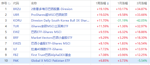 从ETF周涨幅榜看,本周能源股大反攻占据涨幅榜。2倍做多油气服务的ONG $ONG 周涨 35.48%,2倍做多原油的UCO $UCO 涨幅超30%。此外,做多巴西股票指数的BRZU $BRZU 、UBR $UBR 涨幅接近20%。