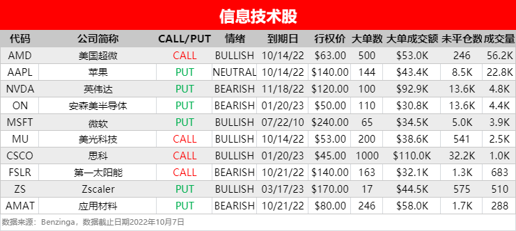重点动态:美国超微出现10月14日到期、行权价为63美元的看涨期权大单。该股上周五收盘重挫近14%,其在最新的Q3业绩预告中披露的收入预期,远不及此前指引的数额,引发了市场对芯片业的担忧。