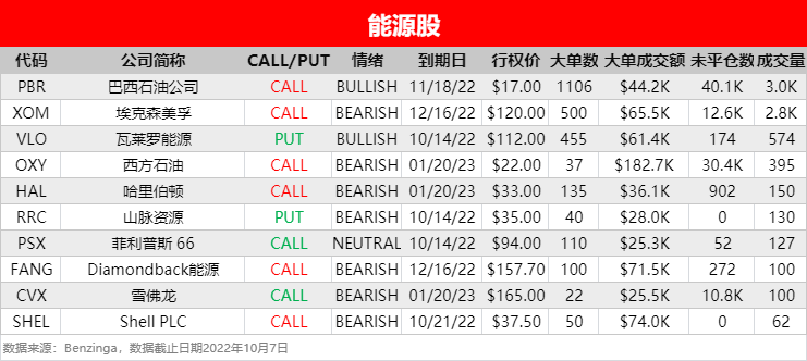 重点动态:OPEC+大幅减产决定推动原油 $CLmain 在上周实现“五连涨”,能源板块多股出现看涨期权大单异动。巴西石油公司 $PBR 出现11月18日到期、行权价格为17美元的看涨期权异动大单。