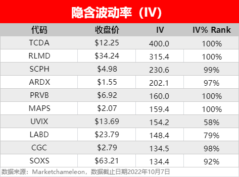 重点动态:美国超微 $AMD Q3业绩指引带崩芯片板块,英伟达 $NVDA 、英特尔 $INTC 等概念股齐挫,3倍做空半导体指数ETF $SOXS 上周五大涨,截至收盘,该ETF涨幅扩大至17.67%,隔夜隐含波动率急升。