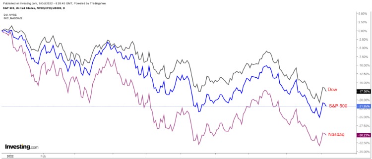再来看看三大指数的表现,标普500指数今年迄今累计下跌21.4%,较1月3日的纪录最高点4818下跌约23%;与此同时,早些时候陷入熊市的纳斯达克指数今年迄今下跌了29.2%,与2021年11月19日的历史高点相比下跌了31.7%;道琼斯指数今年迄今下跌了17.6%,较年初创下的纪录高点下跌了19%。
