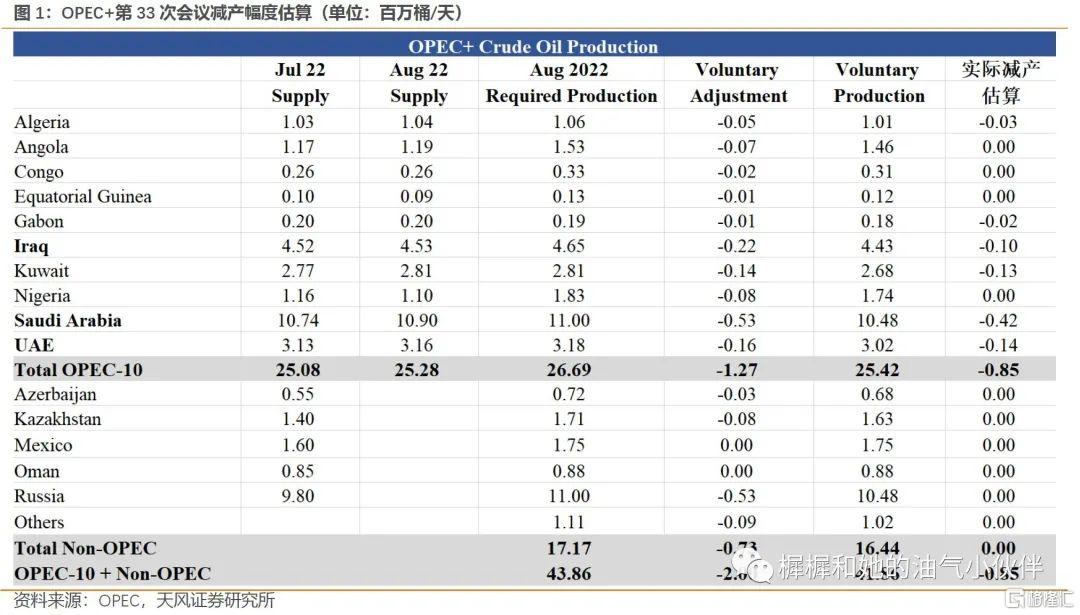 10月5日,第33届欧佩克和非欧佩克会决定总产量从2022年8月的要求产量水平下调200万桶/天。我们初步测算,实际减产幅度在85万桶/天。