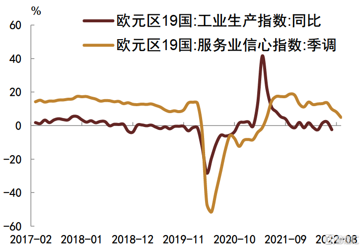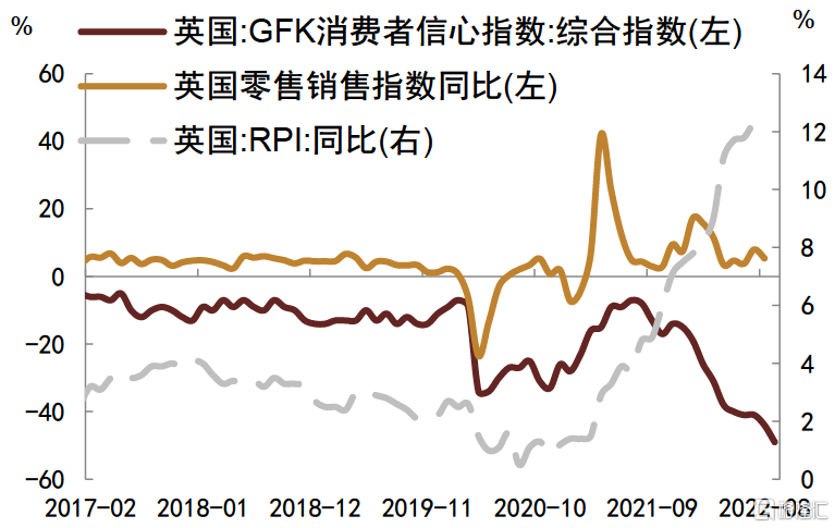 欧洲方面,欧洲天然气供应瓶颈仍为影响通胀走势的重要因素,且除能源外,食品通胀近月来也逐步抬升。我们认为欧洲通胀的粘性来源于3个方面:1)能源食品对外依存度高、进口价格高导致的输入性通胀压力仍大;2)天然气供应紧平衡且预期并不稳定导致能源价格依然高涨;3)以英国为代表的“工资-通胀”螺旋已经形成。在高通胀制约下,欧洲国家经济衰退斜率或较美国更大,目前欧元区和英国消费者信心均已跌至2010年以来的最低位,疫情影响消散带来的服务业强劲反弹或也自三季度起逐步退减,整体看欧洲经济增长预期不算乐观。