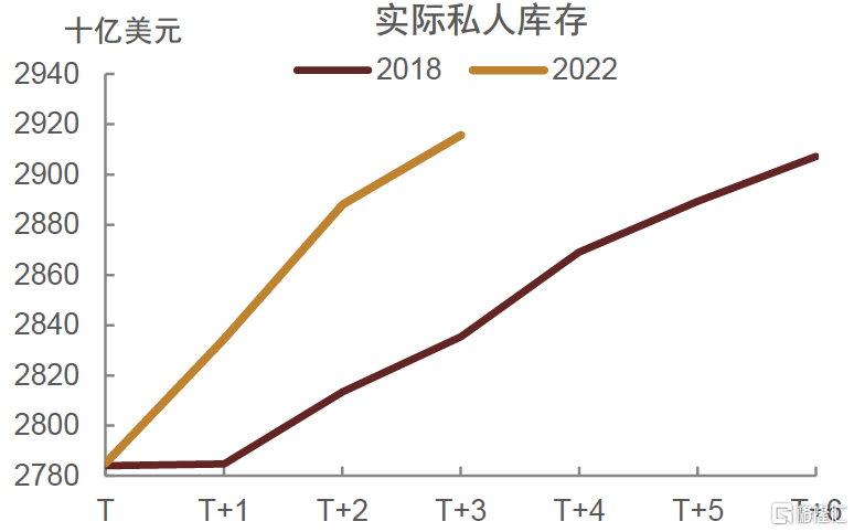 投资方面,2022年二季度美国非金融企业资本性开支同比较2021年四季度大幅下滑14ppt至8%;对应于2018年四季度,非金融企业资本性开支同比较2018年二季度仅小幅下滑2ppt至15%(图6)。同时,2022年二季度美国实际私人存货2.92万亿美元,较2021年四季度增加812亿美元;对应于2018年四季度,实际私人存货2.84万亿美元,较2018年二季度增加505亿美元。这表明此轮紧缩周期对投资的抑制更加明显(图7)。
