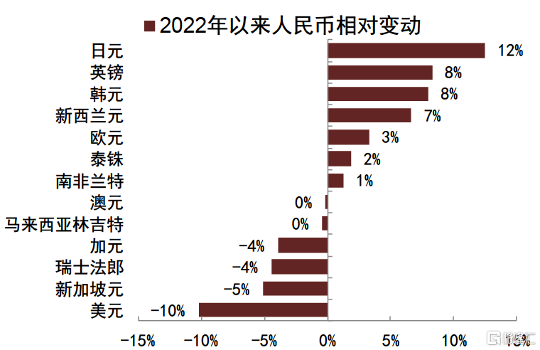 海外主要央行、尤其是美联储的最终加息幅度及后续政策转向与否,会明显影响美元走势及全球风险偏好,进而影响全球资本市场表现。虽然9月中国债券市场也受到了一定外溢影响,国债收益率曲线整体上移逾10bp(图24),截至9月30日,10年期国债收益率较8月末上行14bp至2.76%,但我们认为海外因素更多是市场情绪层面的扰动,从人民币汇率及资金外流情况来看实际影响可控。在人民币汇率变动方面,2022年以来因美元走强,人民币相对于美元有所走弱(图25),截至9月末美元兑人民币在7.1附近,累计贬值约10%,但是人民币对非美货币则保持相对稳健,其中相对于欧元、日元、英镑、韩元等主要货币均走强(图26),显示人民币具有一定抗跌属性。在境外资金流向变动方面,近期海外资金净流出规模相较于今年上半年已有所收缩(图27)。根据托管数据,8月境外机构净减持记账式国债和政金债264亿元,净减持规模环比虽小幅增加,但相较于今年4-5月境外机构月均近860亿元的净减持规模而言已明显收窄,且其持仓占记账式国债及政金债托管总规模比重目前低于10%,对国内债市影响较为有限。而根据EPFR周度数据,9月海外资金周均净流出中国债市4.4亿美元,亦远低于今年4-5月周均16.2亿美元净流出规模。整体而言,我们认为近期人民币贬值导致的资金净流出对中国债市而言主要是短期扰动而非主要矛盾,且目前来看程度弱于今年4-5月,实质影响有限。