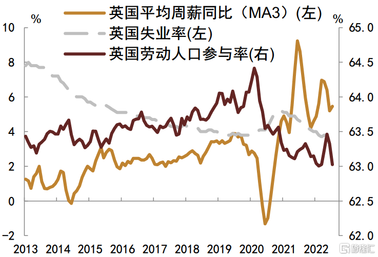 从通胀水平来看,欧元区和英国CPI同比均已达到过10%的高位,超过今年美国CPI同比水平,且目前为止并未出现明显拐点(图15)。从欧元区CPI分项上看,居住与燃料分项仍是贡献最大的分项,与今年上半年持续保持高位的油价,和季节变化与地缘事件影响下供需矛盾愈发冲突的天然气价格有着紧密关系。2022年下半年以来,能源领域的价格高企也开始逐步向其他领域蔓延,欧元区多个CPI分项都保持较高增速,食品价格也开始出现明显抬升。相比6月而言,9月欧洲央行官员对于2022年、2023年欧元区的通胀预期从分别为6.8%、3.5%上调至8.1%、5.5%。展望来看,我们对于欧元区通胀持续性较强的判断主要来源于三个方面:首先从欧洲国家进口结构和进口价格来看,总量层面欧元区国家和英国对于海外进口农产品(包括食品)和能源类产品的依赖度相较于美国要更高,英国、德国、法国农产品和能源产品进口占货物总进口比重均在20%以上,而美国这一比例仅在15%左右,并且从价格方面看,欧洲进口价格指数仍然在不断高升,远超美国水平,输入型通胀压力相较美国要大不少(图16)。第二个层面是,短期内欧洲能源问题可能仍然处于较难得到缓解的状态,虽然从库存变化来看,今年欧洲天然气累库并不算低,但在能源供给预期持续不稳定,且今年冬天气候可能也并不利于天然气供需基本面的情况下,欧洲天然气价格短期内可能难有明显下降,目前来看英国、德国天然气价格均处于2012年以来的相对高位(图17),ECB对于欧洲气价的预期2022年为202.3EUR/Mwh,而在2023年ECB预计气价会进一步大幅上升至360.6EUR/Mwh。第三,英国央行官员在近期公开讲话中多次提到英国劳动参与率下降带来的劳动力市场紧平衡[4],英国劳动力参与率相较于2019年来看下降了0.7个百分点,而经合组织劳动参与率中位数其实在疫情后上升了0.7个百分点,因而英国目前处于低失业率、低劳动参与率、高职位空缺率、工资上涨速度较快的通胀-工资螺旋之中(图18),用人成本上升的压力在英国表现的较为显著,欧元区这一问题虽然并没有英国这么突出,但也存在着失业率位于低位、工资上涨较快的问题;综合以上几个因素进行考量,我们预计欧洲(包括英国)中期内核心通胀可能会随着经济衰退而有所回落,但CPI总项同比和PPI同比仍将维持在较高位置一段时间。
