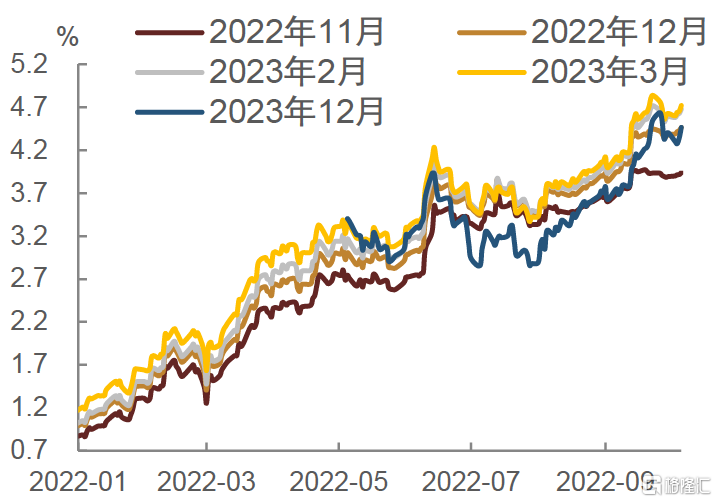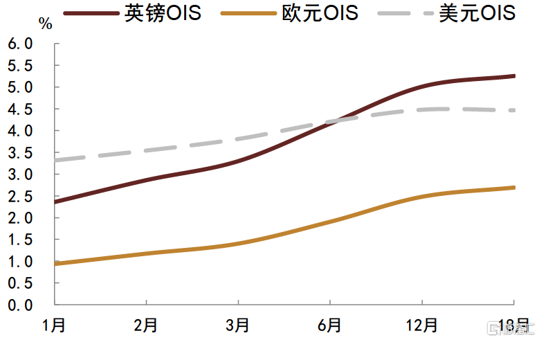 虽然英国和欧元区经济前景并不明朗,但从英央行和欧央行所展现出来的态度看欧洲国家货币紧缩进程并不会因此而受到太多影响。在9月议息会议中,欧央行大幅上调通胀预期,大幅下调经济预期,欧央行行长拉加德也再次欧央行管委会在未来加息路径方面将采取逐会决定(meeting-by-meeting approach)、完全按照通胀数据行事(data dependent)[5]。基于此原则和欧央行对于欧元区通胀“far too high”的判断,欧央行偏鹰的态度基本可以得到确认,缩表方面,欧央行表明仍将按此前计划继续APP与PEPP项下在投资,短期内欧央行或仍以利率工具为主来进行货币政策调控,缩表暂时不构成较大风险。而对于英央行而言,减税计划出台后的短时间购债被英央行定义为“临时性”、“保障金融稳定”性质的政策,英央行首席经济学家Huw Pill也强调这一政策具有临时性和有限性,与已经指定的货币政策紧缩和缩表计划并不冲突[6],英国缩表计划仅仅是在市场流动性受到冲击的背景下有所延迟而非取消。并且在近期英央行官员密集发表的演讲中,英国央行对于通胀的判断仍然是偏高且有持续性,并表现出了对于“工资-通胀螺旋”的担忧,英国货币政策的目标仍然瞄准于中期内通胀达到2%[7],并表明如果前景表明通货膨胀压力更加持续(包括更强劲的需求带来的压力),委员会将在必要时作出有力的回应。从OIS市场所反应的预期来看,未来18个月内欧洲和英国的加息路径或相较美国而言更加陡峭(图22),市场隐含利率曲线指向英国、欧洲加息终点在明年2-3季度(图23),我们预计英国年内剩余两次议息会议可能分别加息75bp、50bp,政策利率回升至3.5%,欧央行不排除10月继续加息75bp的可能性,年内存款便利利率或升至1.75%左右,我们认为,总体看欧洲本轮加息停止时间应当晚于美国一个季度左右,由于欧洲所面临的不确定性相较于美国更高,欧元区在经济衰退预期较高的背景下加息整体幅度或不及美国,而英国目前面临的通胀粘性以及央行态度或表明英国加息幅度可能与美国持平甚至更高。