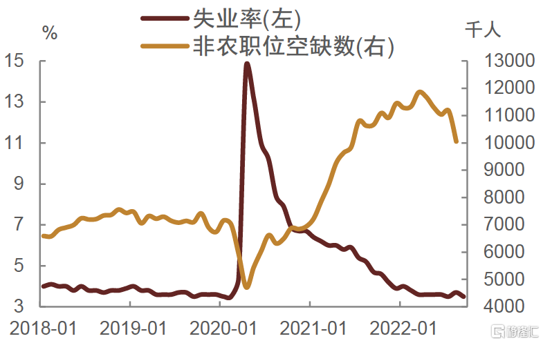 图10: 9月失业率低位下行;非农职位空缺数虽较历史高点下滑但仍在高位