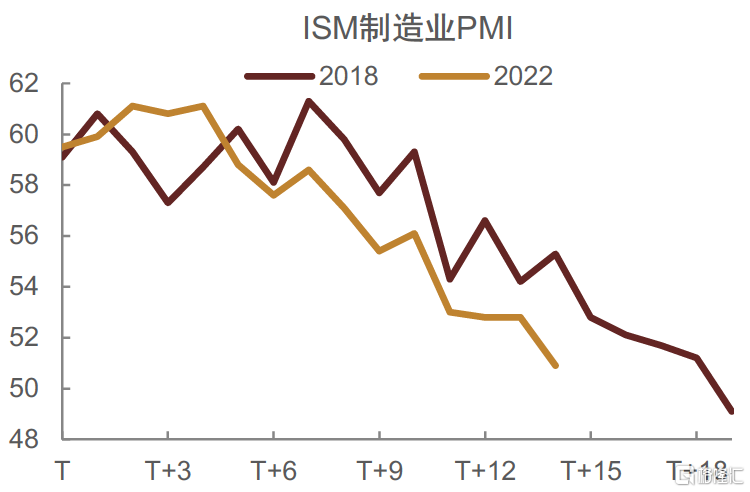 从历史表现来看,市场的担心不无道理。美联储上一轮紧缩周期是在2017-2019年。2017年3月至2019年8月,美联储连续8次加息、累计200bp将联邦基金目标利率区间加至2%-2.25%。同时,2017年10月起美联储开启缩表,并于2019年8月结束。假设此次加息结束时点与目前市场预期一致,即在明年一季度,那么可对应于上轮紧缩周期中的2019年三季度,其他时间以此类推。在这一假设下,我们对两次紧缩期间经济指标的下滑程度进行对比。