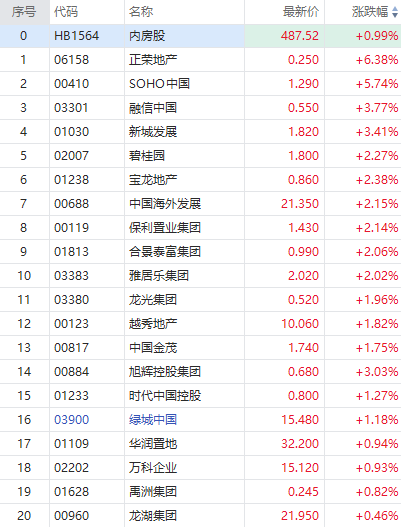 华盛资讯10月10日消息,今日港股内房股逆市走高,正荣地产涨超6%,融信中国涨近4%,新城发展涨超3%,碧桂园涨超2%,绿城中国涨超1%,万科企业涨近1%。
