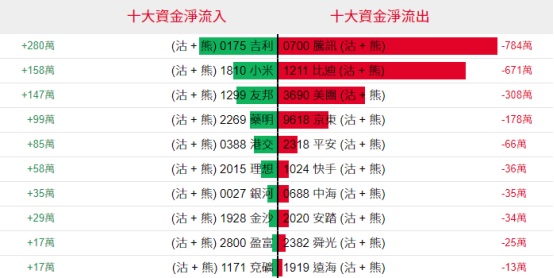 淡仓(认沽证及熊证)方面,上周五腾讯、比迪相关淡仓单日分别获784万、671万港元资金净流出。