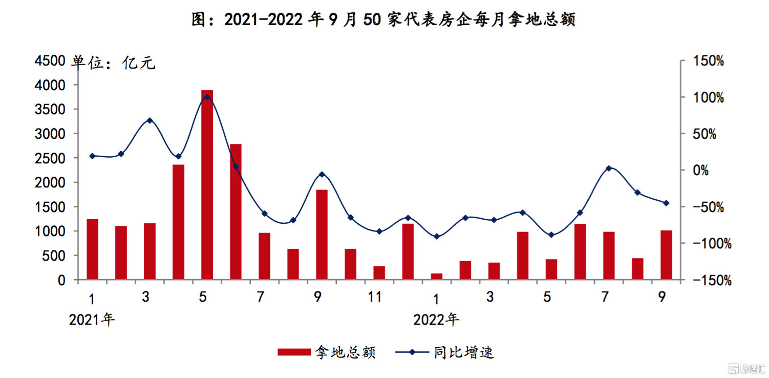 近日,中指研究院发布了《2022年1-9月全国房地产企业拿地TOP100排行榜》。数据显示,9月50家代表房企拿地总额同比下降45.3%,降幅较上月扩大;环比大幅上涨130.2%。