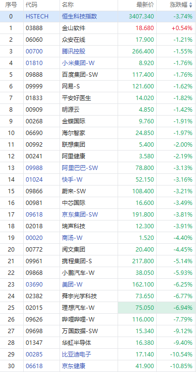 科网股走弱,腾讯跌超1%,小米跌近2%,快手-W、阿里巴巴、京东跌超3%,美团跌超6%,哔哩哔哩跌近8%。