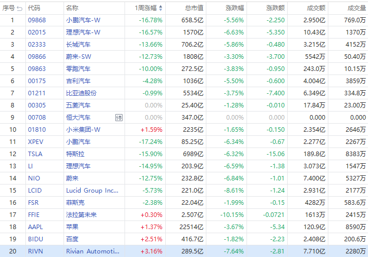 截至发稿,上周新能源造车企业股价多数走弱。港股方面,造车新势力“蔚小理”齐挫,小鹏汽车-W、理想汽车-W近一周跌超16%,长城汽车跌逾13%;美股方面,特斯拉一周跌15.9%,小鹏美股跌逾17%,LCID走跌,RIVN收涨。
