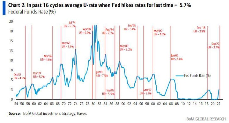 虽然9月新增非农就业人口是2021年4月以来的最小月度增幅,但仍超过了市场的预期。且更要命的是,失业率意外下降至3.5%,位于50年来的最低水平。从历史数据来看,强劲的就业市场都会坚定美联储加息的决心。美银统计了过去60年里美联储的15次加息周期,每个周期美联储最后一次加息时,美国的失业率平均是5.7%。