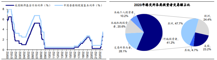 海通证券通过复盘回顾历史上港股见底背景,发现其走势与A股、美股均高度相关。主要原因在于,港股作为离岸市场,基本面由内地经济决定,而流动性又受到海外市场影响。港元与美元直接挂钩、2020年外资交易占比达到41.2%(美资23.2%),说明港股与美股走势关系密切。
