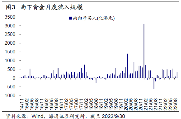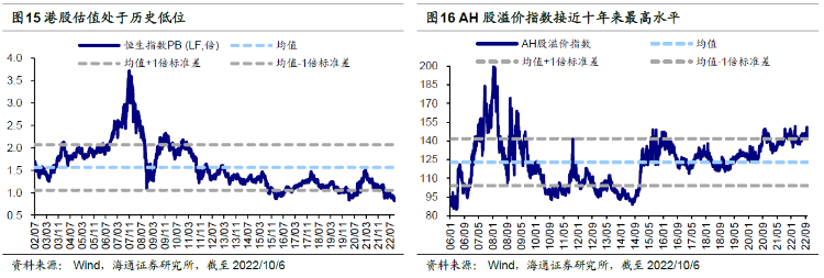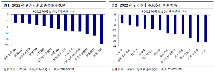 回顾:9月港股持续回调。9月全球主要市场指数均下跌,港股市场跌幅较大,港股表现弱于A股。9月恒生指数持续回调,截至2022/9/30(下同)当月累计涨跌幅/最大跌幅为-13.7%/-14.2%。对比其他市场,沪深300指数9月累计涨跌幅/最大跌幅为-6.7%/-7.9%,A股创业板指为-10.9%/-12.0%,恒生科技指数为-19.3%/-21.1%,纳斯达克指数为-10.5%/-13.8%,标普500为-9.3%/-13.0%,日经225为-7.7%/-10.0%,英国富时100为-5.4%/-9.1%,德国DAX为-5.6%/-12.5%。从市场走势看,恒生指数从9月1日就开始持续下行,9月30日达到当月最低点17016.3点。从行业表现来看,9月港股各行业均下跌,其中工业(-20.9%)、医疗保健业(-20.8%)、资讯科技业(-17.8%)跌幅最大。9月南下资金净流入规模为349.0亿港元,截至2022/9/30南下资金有史以来累计净流入额达24377.4亿港元。9月当月南下资金在港股成交额中占比为13.3%,相较于8月有所下降。