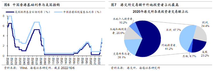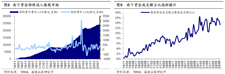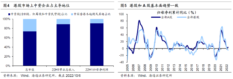 港股走势与A股和美股密切相关。从历史上看,港股的走势与A股和美股均高度相关,背后原因在于港股作为离岸市场,基本面由内地经济决定,而流动性受海外市场的影响。从基本面来看,中资企业在港股市场上占主导地位,截至2022/10/4港股中资股总市值达到36.8万亿港元,占全部港股的比重为73.6%;22H1港股中资股营收/归母净利润为24.0/2.3万亿港元,占全部港股的88.9%/90.7%,因此可以看到,港股和A股的归母净利累计同比的走势基本保持一致。从流动性来看,中国香港实施联系汇率制度,港元与美元直接挂钩,因此中国香港的贴现窗基本利率水平与美国的联邦基金目标利率水平走势一致;同时,外资在港股市场占主要地位,2020年港交所外地投资者交易额占比达41.2%,其中欧美地区占比较高,美国投资者交易额占比为23.2%。不过,近年来南下资金持续流入港股,在港股的话语权也得以提升,22/08南下资金成交额占港股总成交额占比达到13.3%,因此港股资金面与A股的联系也愈发紧密。