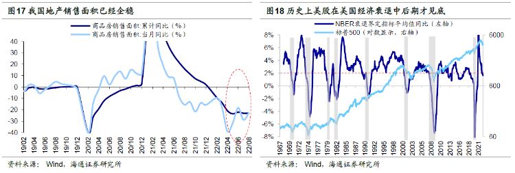借鉴历史,未来港股见底回升需等待A股和美股企稳。当前港股已经破净,估值处于历史低位,截至2022/10/6恒生指数PB(LF)为0.87倍,自02年有数据以来分位数为0.2%,恒生沪深港通AH股溢价指数为143.8点,自06年有数据以来分位数为88.9%,可见港股当前长期配置价值凸显。展望未来,港股何时能够见底回升,根据上文对历史的回顾,我们认为港股见底回升需等待A股和美股企稳。对于A股而言,国内经济基本面是关键点,其中地产是重要因素之一。我们认为随着保交楼和稳增长政策落地,有望催化A股市场再次开启新一轮上涨,从而对港股形成正向的拉动作用。但是,美股何时见底尚未清晰,NBER指标显示美国经济在今年7月时已经进入技术性衰退,按照历史规律,美股在美国经济衰退中后期才见底,因此预计美股大约在今年四季度或明年初见底,这就意味着美股对港股可能仍有负面影响。综上所述,由于美股难言见底,港股见底企稳可能还需要继续等待,但考虑到港股已经在底部区域,并且A股也有望开启新一轮上涨,因此对港股不必过度悲观。