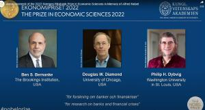 北京时间10月10日晚,2022年诺贝尔经济学奖得主揭晓。美联储前主席伯南克、Douglas W.Diamond和Philip H.Dybvig获得这一奖项,表彰他们对银行和金融危机的研究。