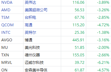 费城半导体指数跌超3%,创2020年11月份以来新低。美股半导体板块延续跌势,高通跌超4%,英伟达、美国超微公司跌超3%,台积电、德州仪器跌超2%。