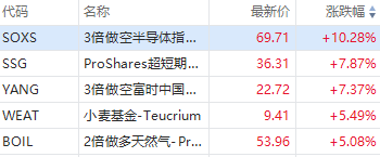 ETF方面,3倍做空半导体指数 $SOXS 涨超10%,2倍做多彭博天然气 $BOIL 涨超5%。