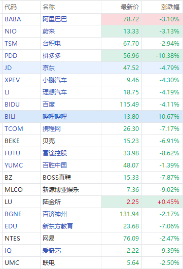 华盛资讯10月10日消息,纳斯达克中国金龙指数跌超5%,报5770点。拼多多、哔哩哔哩大跌超10%,爱奇艺、新濠博亚娱乐跌超9%,新东方、BOSS直聘、携程网跌超7%,京东、小鹏汽车、理想汽车、百度跌超4%,阿里巴巴、蔚来跌超3%。