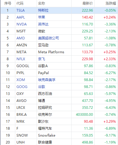 受到原油期货价格下跌影响,周一美股原油板块普遍下跌。成交额第11名埃克森美孚收跌2.17%,成交16.6亿美元。第12名西方石油公司收跌5.97%,成交16.2亿美元。