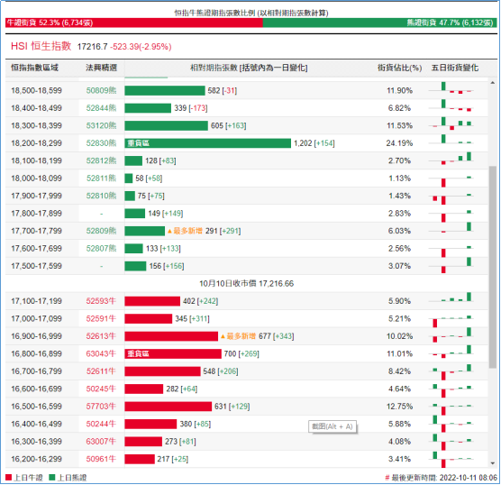 街货分布方面,至周一,恒指牛证街货在收回价16600点至17200点之间,累计相当约2135张期指合约;恒指熊证街货在收回价18100点至18600点之间,累计相当约2672张期指合约。