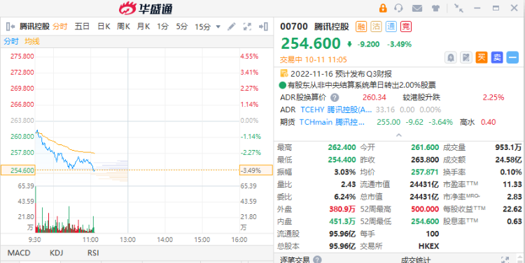 华盛资讯10月11日消息,腾讯今日再度走低,截至发稿,现跌3.49%,报254.6港元,创2018年11月以来新低,市值2.44万亿港元,成交额24.58亿港元。