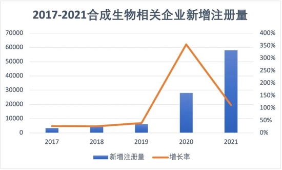 “热钱”涌入的同时,这个领域内也出现了大量的新玩家。根据企查查向《财经十一人》提供的数据,合成生物相关企业的新增注册量在2017年至2019年的变化不大,保持在每年6000家以下,2020年之后却突然发生飞跃式增长,当年大幅增加355%至2.8万家,2021年更是达到5.8万家,2022年前七个月也已达到3.8万家。