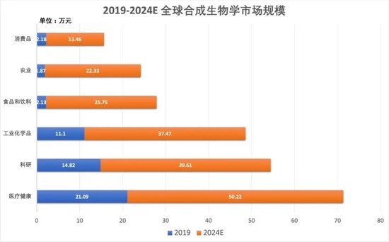 根据CB Insights数据,2019年全球合成生物学市场规模为53亿美元,预计到2024年将达到189亿美元,复合年均增长率(CAGR)为28.8%。在这一过程中,合成生物技术应用在食品饮料、农业和消费品领域的增速将远超大盘的平均水平。