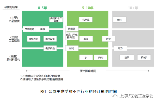 合成生物学对不同行业的预计影响时间。图片来源:上海市生物工程学会